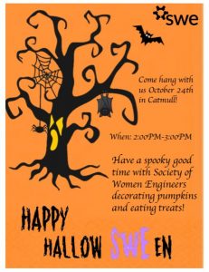 Join SWE for their fall Halloween social! We will be decorating pumpkin and eating fall themed treats. Learn more about SWE and hang out with our members on 10/24 from 2-3pm in Catmull Gallery.
