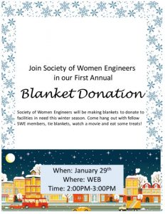Come join SWE in making blankets to donate to facilities in need this winter season. The event will take place Monday January 29th from 2:00PM-3:00PM in WEB 1460 where we will be tying blankets, eating snacks, watching a movie, and catching up with friends! Bring your friends to help this cause.