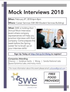 SWE is holding their annual Mock Interview event with their corporate sponsors on Thursday February 8th 6pm - 8pm in SSB350! Come practice interviewing and receive professional feedback on your performance. Brush up on your interview skills the week before the spring career fair! Sign up today at http://bit.ly/2n10kAg. Food will be provided. Mock Interviews…